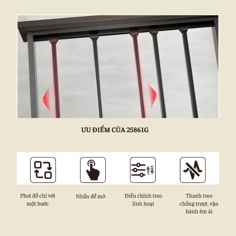 Với giá treo quần áo 25861G, trải nghiệm giặt phơi trở nên gọn gàng và tinh tế hơn mỗi ngày. Quần áo được treo ổn định, không trượt rơi, không gây tiếng ồn; khi đóng lại, toàn bộ giàn phơi được giấu kín trong tủ, giữ không gian luôn sạch sẽ, ngăn nắp và đúng chất sống hiện đại.